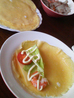 お昼は弟とクレープの生地を焼いて、お肉やエビ、焼きトマトキャベツを巻いてマヨネーズをかけました。